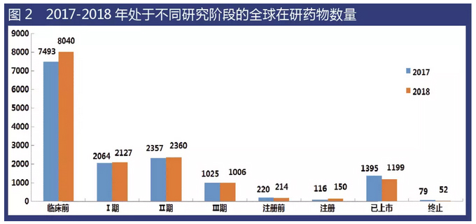 通過對(duì)比2018年和2017年處于不同研發(fā)階段的在研藥物規(guī)模后發(fā)現(xiàn),所有階段的在研藥物數(shù)量基本維持不變或僅有小幅變動(dòng)。
