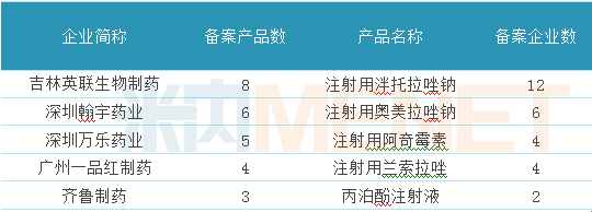 表2:注射劑一致性評價參比制劑備案企業(yè)及產(chǎn)品TOP5