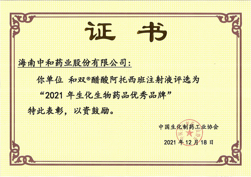 2021年12月18日,在北京召開的“中國生化制藥工業(yè)協(xié)會(huì)第八屆會(huì)員大會(huì)暨2021年協(xié)會(huì)年會(huì)”上,海南中和藥業(yè)產(chǎn)品和雙?醋酸阿托西班注射液榮獲“2021年生化生物藥品優(yōu)秀品牌”稱號(hào)。
