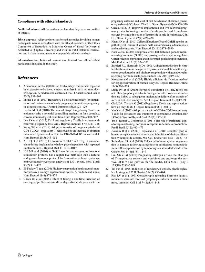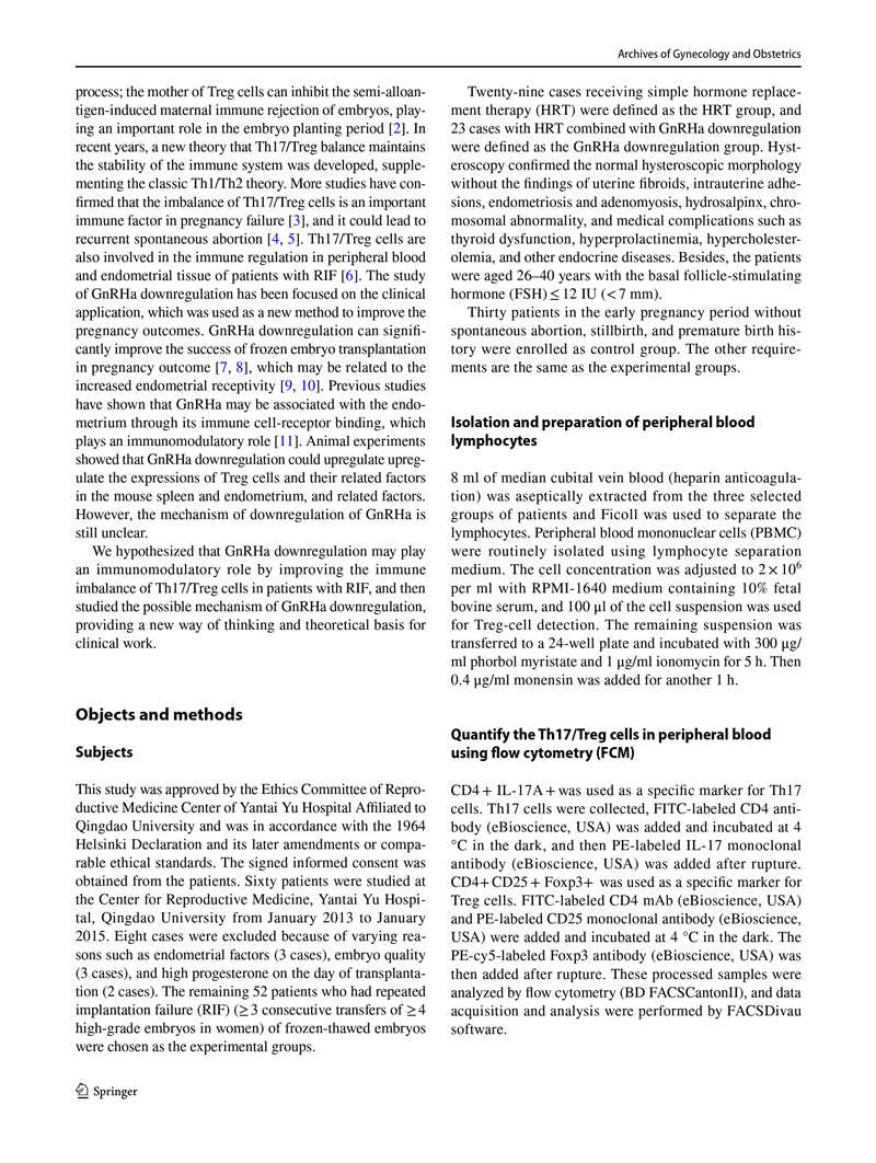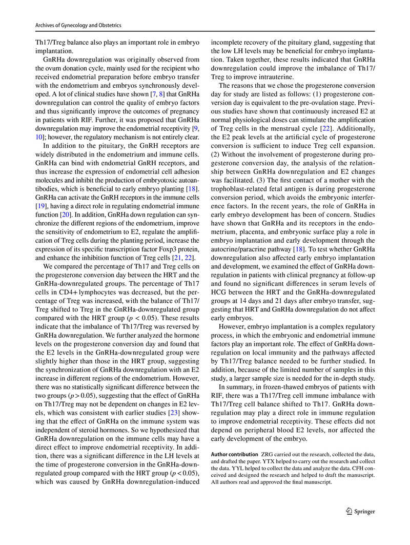 結(jié)論:在不明原因的RIF患者中,Th17和Treg細(xì)胞數(shù)量分別增加和減少,Th17 / Treg細(xì)胞比值失衡。GnRHa降調(diào)可能通過阻斷Th17/Treg細(xì)胞比值失衡發(fā)揮免疫調(diào)節(jié)作用從而提高子宮內(nèi)膜容受性。這些作用不依賴于外周血中的E2水平,也不影響早期胚胎發(fā)育。