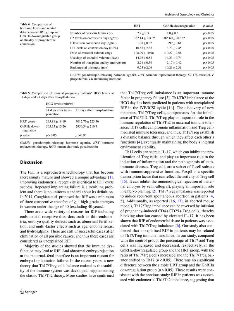結(jié)果:HRT前,HRT組與對(duì)照組相比,CD4+淋巴細(xì)胞中的Th17和Treg細(xì)胞數(shù)量分別增加和減少,Th17 / Treg細(xì)胞比值升高(p<0.05)。在孕酮轉(zhuǎn)化當(dāng)天,與HRT組相比,GnRHa降調(diào)組的Th17和Treg細(xì)胞百分比分別降低和升高,Th17 / Treg細(xì)胞比值顯著降低(p<0.05)。GnRHa降調(diào)組的雌激素(E2)水平略高于HRT組,兩組間差異無統(tǒng)計(jì)學(xué)意義(p> 0.05)。此外,HRT組和GnRHa降調(diào)組在移植后第14天和第21天的絨毛膜促性腺激素水平?jīng)]有顯著差異(p>0.05)。