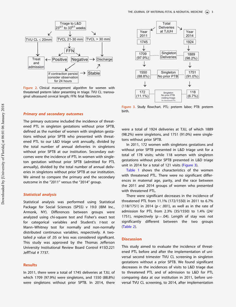 研究設(shè)計(jì):這是一項(xiàng)回顧性隊(duì)列研究,研究對象是2011年(1月1日至12月31日)和2014年(1月1日至12月31日)因先兆早產(chǎn)在Thomas Jefferson大學(xué)醫(yī)院(TJU)(賓夕法尼亞州費(fèi)城)就診的所有孕23 + 0/7至33 + 6/7周之間且既往無SPTB的單胎妊娠孕婦。自2012年1月1日開始起的兩年中開展TVU