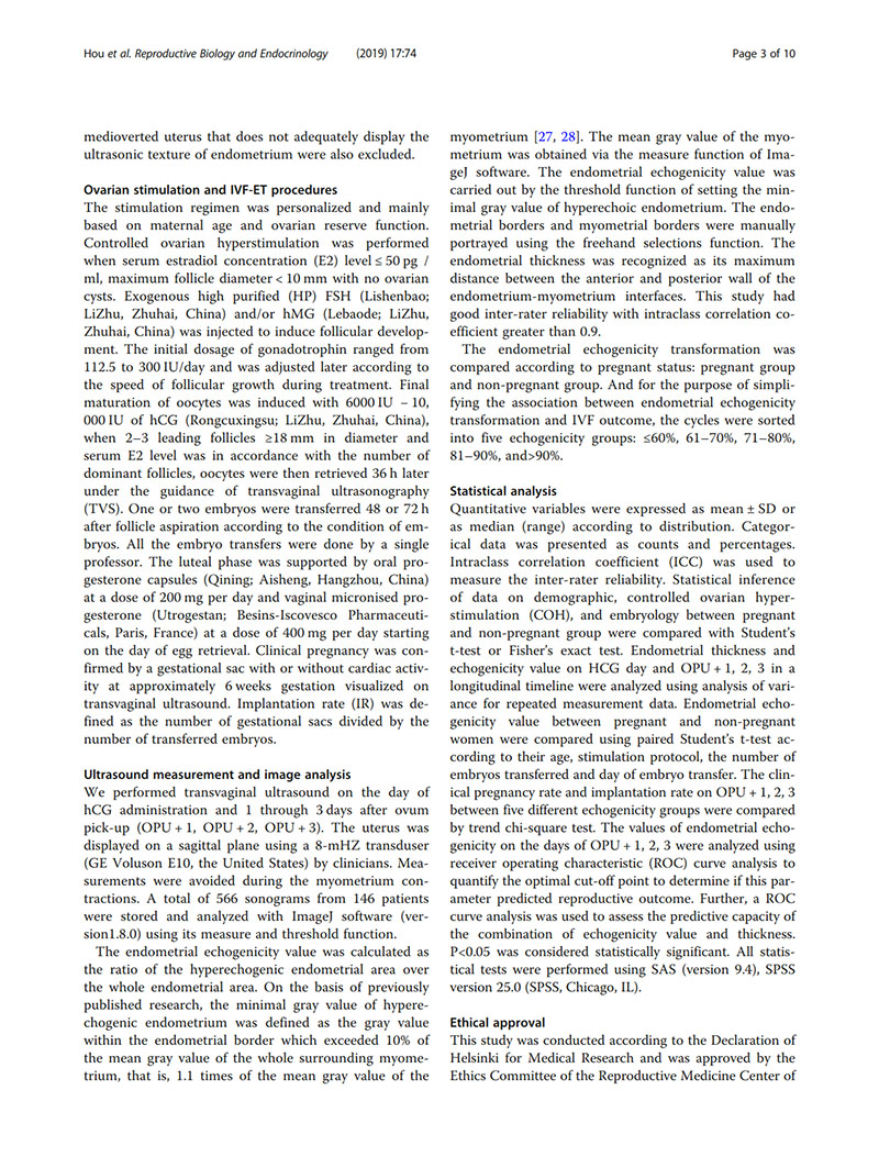 背景:非侵入性測量子宮內(nèi)膜容受性的方法很有價值,因為它有可能改善體外受精(IVF)結(jié)局。有人認為hCG給藥當天的子宮內(nèi)膜回聲是子宮內(nèi)膜容受性的良好標志。在日常實踐中,我們注意到胚胎移植日子宮內(nèi)膜非均質(zhì)高回聲的患者通常妊娠率較低。因此,我們將延伸擴展了hCG觸發(fā)后子宮內(nèi)膜回聲模式轉(zhuǎn)化的研究,以分析子宮內(nèi)膜回聲改變與IVF結(jié)局之間的關(guān)系。