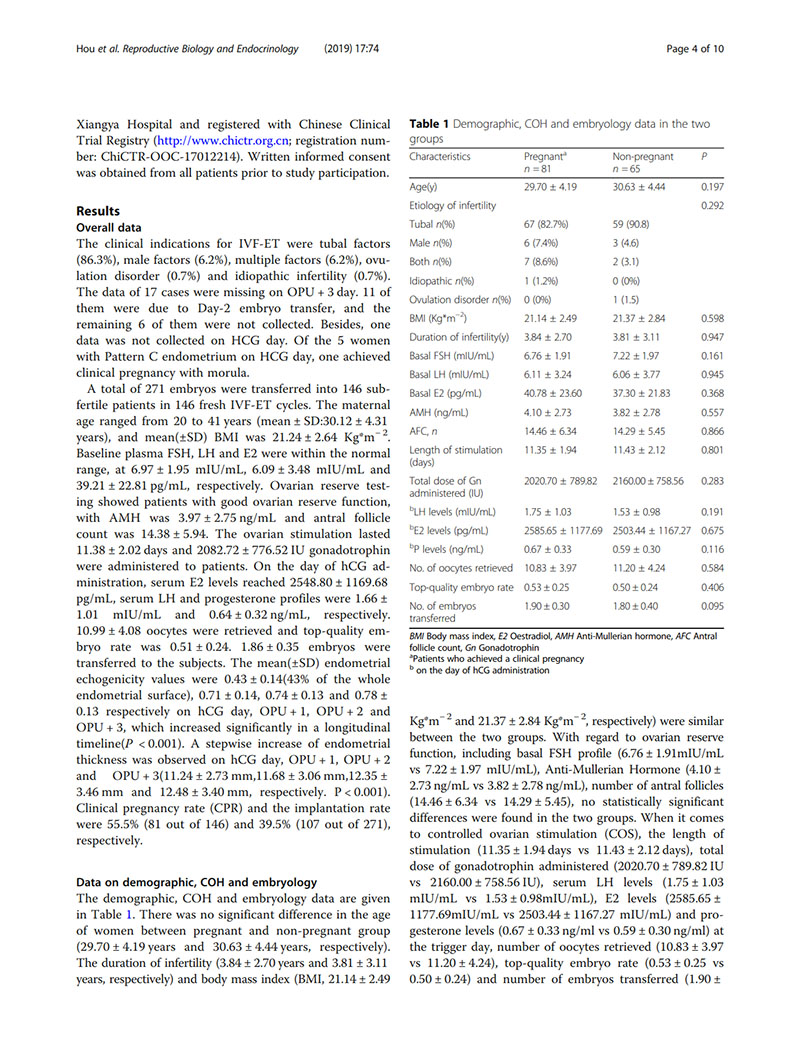 方法:在2017年8月至2018年8月,前瞻性隊列研究共招募了146名首次接受體外受精周期的不孕女性。監(jiān)測這些患者在hCG日和取卵后1-3天(OPU + 1, OPU + 2, OPU + 3)的子宮內(nèi)膜回聲模式。