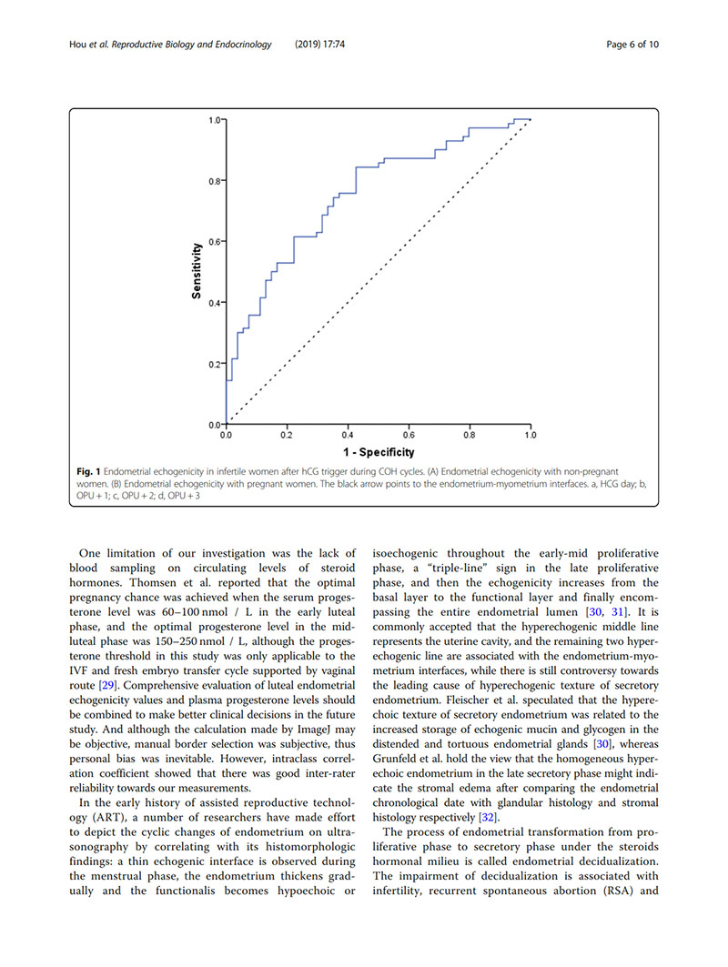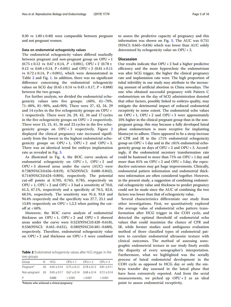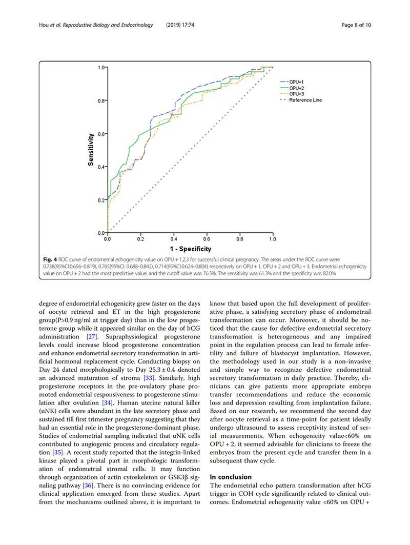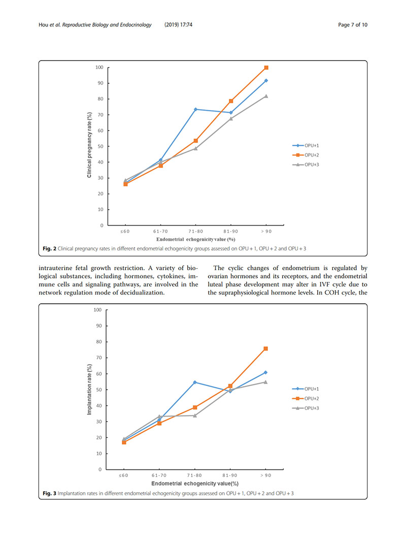 結(jié)論:建議用取卵后第2天(OPU+2)的子宮內(nèi)膜回聲值評價子宮內(nèi)膜容受性。當OPU+2的回聲值<60%時,臨床醫(yī)生似乎適合提供“全冷凍”IVF周期,并在隨后的凍融胚胎周期中進行移植。